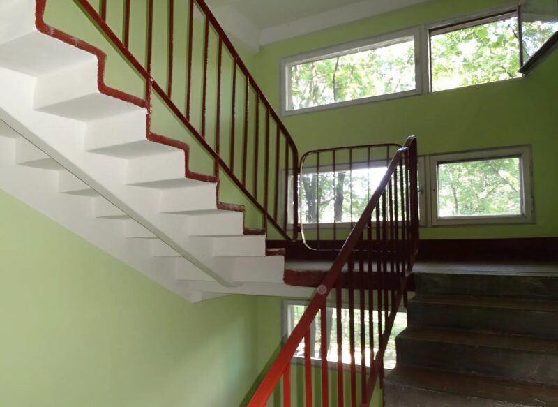 She suddenly switched on all the lights on the landing, illuminating the dark stairwell, and banged with all her strength on the nearest door.