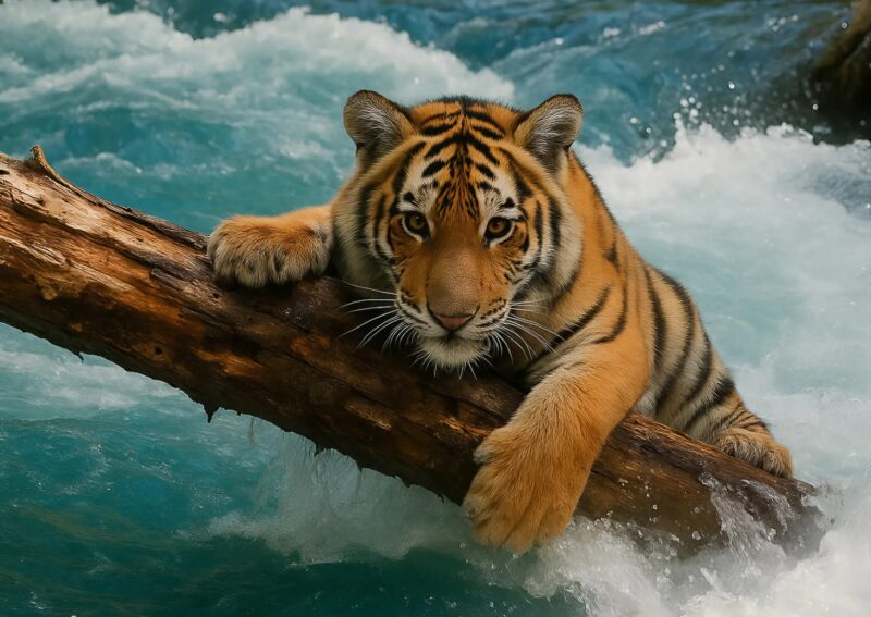 The icy, rapid waters swirled him around like a toy. In despair, the tiger cub clutched onto a broken branch sticking out of the water. His tiny claws dug into the bark, his eyes widened in terror, and his heart pounded as if it were ready to burst out of his chest.