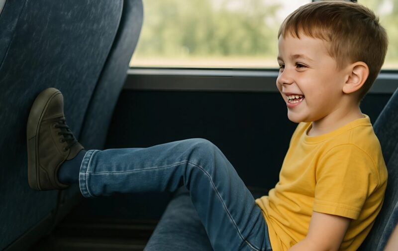 The boy continued to misbehave, annoying everyone, and kicked the seat even harder. When he saw that people were getting angry, he only laughed louder, as if he enjoyed the scene.