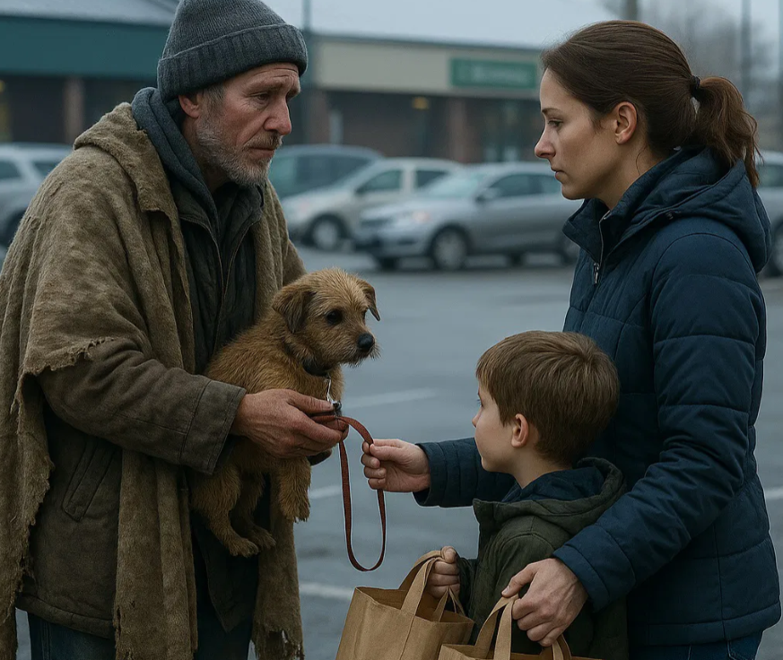 As I loaded the last bag into the trunk, I noticed a figure sitting near the edge of the parking lot. A man, wrapped in a tattered blanket, hunched against the cold. His cheeks were red, his eyes hollow with fatigue. Beside him sat a small, scruffy dog, shivering against his leg. Something about the way he kept his hand protectively on the dog’s back made me pause.