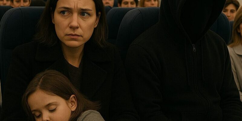 Row 22, evening flight Denver → New York. She was still wearing the wool coat she hadn’t taken off since the funeral. Her five-year-old daughter was asleep, his head resting on her arm. Beside her sat a silent man, hood pulled low, saying nothing.