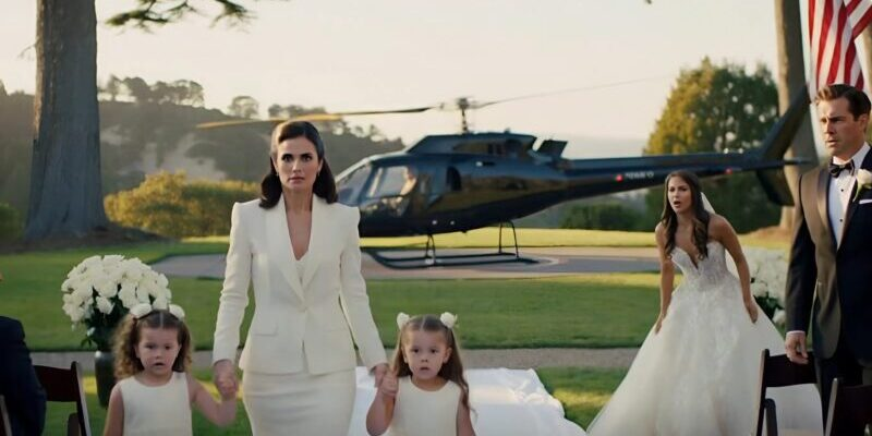 The woman in white walked down the aisle with the confidence of someone who once belonged there — because she had. She stopped where rose petals blended into the carpet, the American flag on the veranda fluttering in the afternoon heat, and the silence of three hundred held breaths made room for one voice.