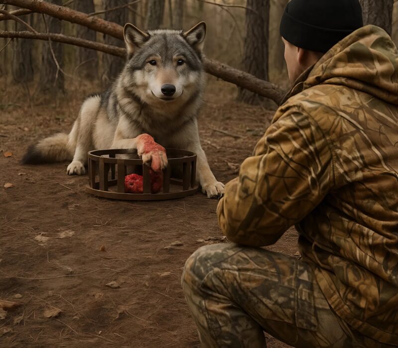 He took a slow step forward, careful not to look the wolf directly in the eyes so as not to seem threatening. The wolf didn’t growl — it just breathed quietly, watching his every movement. The man crouched down, carefully opened the trap, freed the wolf’s paw, and stepped back a few paces.